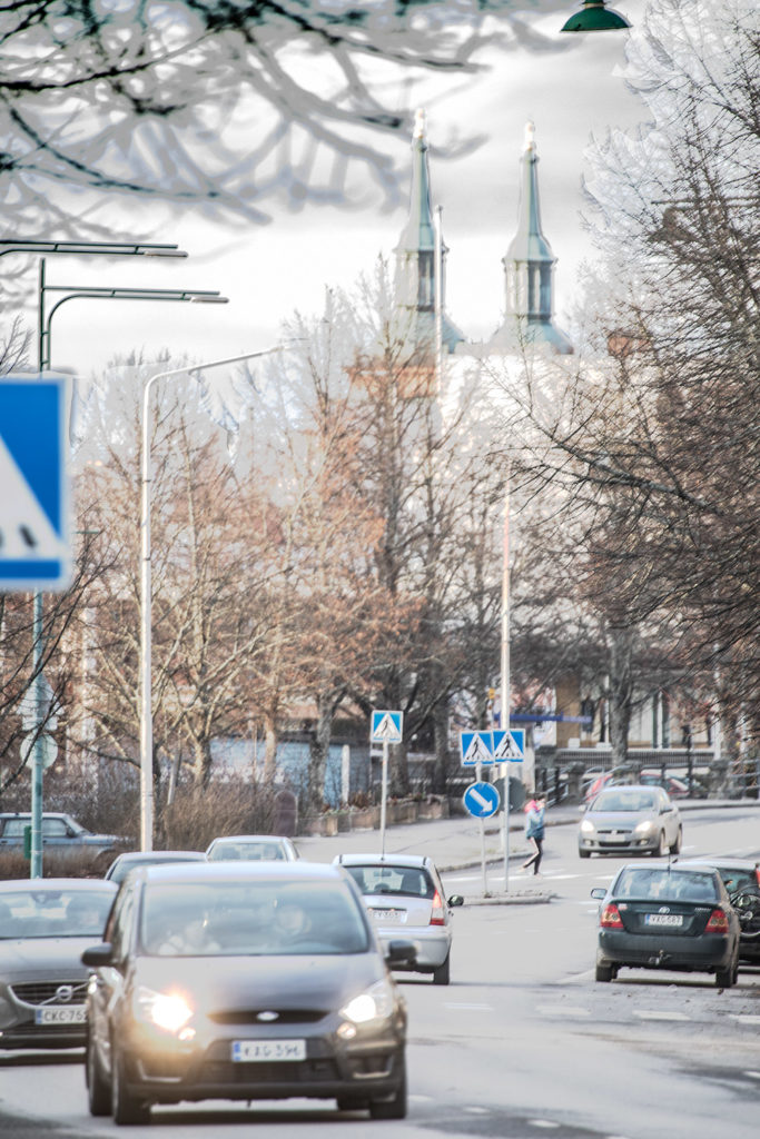 Kaupunki ja seurakunnan kaksitorninen pääkirkko vaalisunnuntain iltapäivävalossa toimituksen ikkunasta nähtynä.