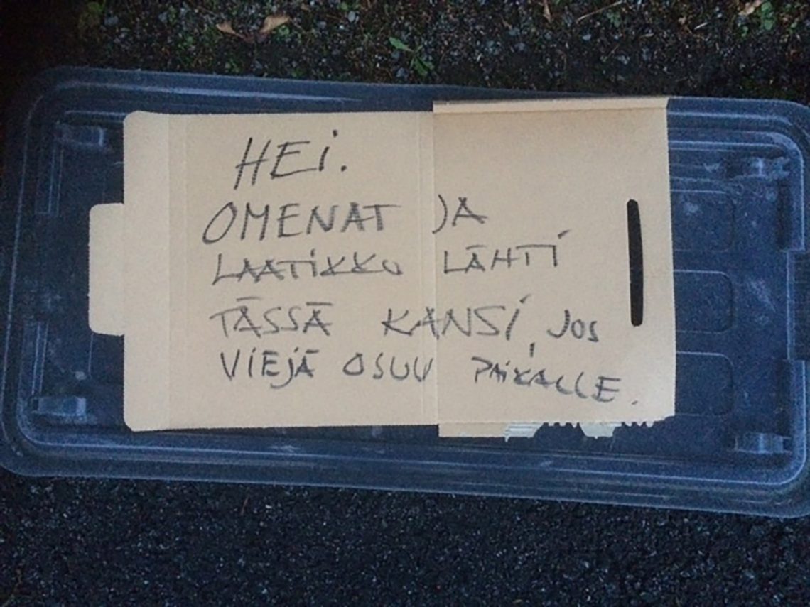 Ylimääräisiä omenoitaan kadun varteen jakoon pannut hyväsydäminen omakotiasukas on myös huumorintajuinen. Kun omenoiden mukana katosi jälleen myös astia, jossa ne olivat tarjolla naposteltaviksi, laittoi Vammalan keskustassa sijaitsevan talon isäntä tarjolle myös muovilaatikon kannen. Pelkällä kannellahan ei tee juuri mitään.