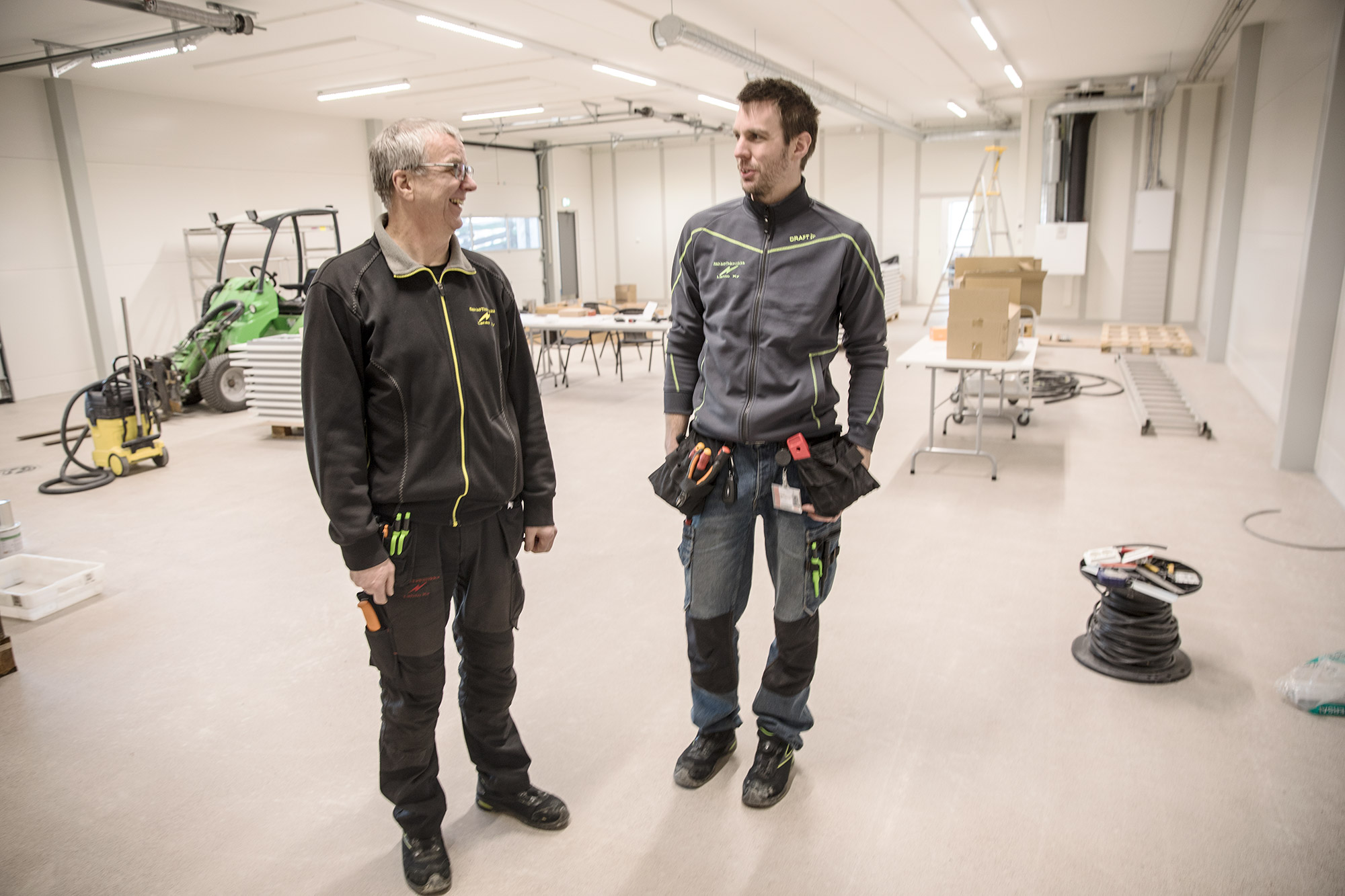Yrittäjä Esko Lehto ja yrityksen sähkötöiden johtaja Lauri Lehto ovat tyytyväisiä vuodenvaihteessa käyttöön otettaviin uusiin toimitiloihin. Kuvaa saa suurennettua napsauttamalla sitä.